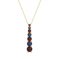 This Ruby and London Blue Topaz Necklace is casted in 14k Yellow Gold. This Women’s Classic necklace features exceptionally fine gemstones, on par with those found in the world's most exclusive boutiques and among the top 10% available globally. Linear Pendant Featuring A Graduated Series Of Round Stones, increasing in Size From Top To Bottom. A Sleek And Stylish Design. This necklace comes with a complimentary 18-inch chain. Enjoy the confidence of our 30-day, stress-free return policy—with return shipping fully covered. Each piece is also accompanied by a Lifetime Warranty, ensuring lasting beauty and peace of mind.