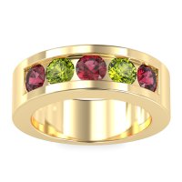 This mens Lab Ruby ring features AAAA gemstones, along with fine quality Peridot. This mens 18k Yellow Gold ring will stand the test of time, mirroring the bond it symbolizes. with Several Diamonds Securely Held in A Channel Setting Across The Top, This Attractive 8mm Men's Band Offers A Timeless And Sophisticated Look. Unique mens wedding bands say what words can't - about his style, his passions, his love. Choose from a variety of gems and metals to make custom rings for men! Free shipping, returns, resizing, and a lifetime warranty make choosing this product easy.
