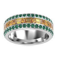 This mens Citrine ring features AAAA gemstones, along with fine quality Emerald. This mens Platinum ring will stand the test of time, mirroring the bond it symbolizes. This Three-row Men's Eternity Band Offers A Captivating Contrast in Stone Cuts, Featuring An Emerald-cut Center Framed By Two Rows Of Round Stones. Width Of This Ring Is 8mm. Unique mens wedding bands say what words can't - about his style, his passions, his love. Choose from a variety of gems and metals to make custom rings for men! Free shipping, returns, resizing, and a lifetime warranty make choosing this product easy.