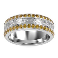 This mens Diamond ring features AAAA gemstones, along with fine quality Citrine. This mens 14k White Gold ring will stand the test of time, mirroring the bond it symbolizes. This Three-row Men's Eternity Band Offers A Captivating Contrast in Stone Cuts, Featuring An Emerald-cut Center Framed By Two Rows Of Round Stones. Width Of This Ring Is 8mm. Unique mens wedding bands say what words can't - about his style, his passions, his love. Choose from a variety of gems and metals to make custom rings for men! Free shipping, returns, resizing, and a lifetime warranty make choosing this product easy.