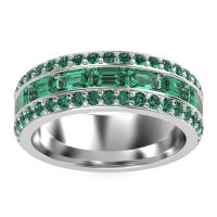 This Platinum Emerald mens wedding ring features top quality Emerald, amongst those found in fine jewelry boutiques across the world. This mens ring can be worn as a mens Emerald wedding band, or it can be worn as a general mens gemstone ring. This Three-row Men's Eternity Band Offers A Captivating Contrast in Stone Cuts, Featuring An Emerald-cut Center Framed By Two Rows Of Round Stones. Width Of This Ring Is 8mm. Enjoy total worry-free shopping with our free shipping, returns, resizing, and lifetime warranty.
