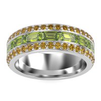 This mens Peridot ring features AAAA gemstones, along with fine quality Citrine. This mens 18k White Gold ring will stand the test of time, mirroring the bond it symbolizes. This Three-row Men's Eternity Band Offers A Captivating Contrast in Stone Cuts, Featuring An Emerald-cut Center Framed By Two Rows Of Round Stones. Width Of This Ring Is 8mm. Unique mens wedding bands say what words can't - about his style, his passions, his love. Choose from a variety of gems and metals to make custom rings for men! Free shipping, returns, resizing, and a lifetime warranty make choosing this product easy.