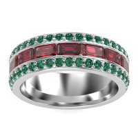 This mens Ruby ring features AAAA gemstones, along with fine quality Emerald. This mens Palladium ring will stand the test of time, mirroring the bond it symbolizes. This Three-row Men's Eternity Band Offers A Captivating Contrast in Stone Cuts, Featuring An Emerald-cut Center Framed By Two Rows Of Round Stones. Width Of This Ring Is 8mm. Unique mens wedding bands say what words can't - about his style, his passions, his love. Choose from a variety of gems and metals to make custom rings for men! Free shipping, returns, resizing, and a lifetime warranty make choosing this product easy.