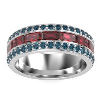 This mens Ruby ring features AAAA gemstones, along with fine quality London Blue Topaz. This mens Platinum ring will stand the test of time, mirroring the bond it symbolizes. This Three-row Men's Eternity Band Offers A Captivating Contrast in Stone Cuts, Featuring An Emerald-cut Center Framed By Two Rows Of Round Stones. Width Of This Ring Is 8mm. Unique mens wedding bands say what words can't - about his style, his passions, his love. Choose from a variety of gems and metals to make custom rings for men! Free shipping, returns, resizing, and a lifetime warranty make choosing this product easy.