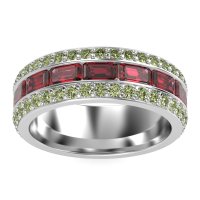 This mens Ruby ring features AAAA gemstones, along with fine quality Peridot. This mens Palladium ring will stand the test of time, mirroring the bond it symbolizes. This Three-row Men's Eternity Band Offers A Captivating Contrast in Stone Cuts, Featuring An Emerald-cut Center Framed By Two Rows Of Round Stones. Width Of This Ring Is 8mm. Unique mens wedding bands say what words can't - about his style, his passions, his love. Choose from a variety of gems and metals to make custom rings for men! Free shipping, returns, resizing, and a lifetime warranty make choosing this product easy.