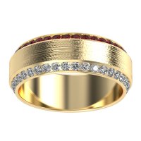 This mens Ruby ring features AAAA gemstones, along with fine quality Diamond. This mens 14k Yellow Gold ring will stand the test of time, mirroring the bond it symbolizes. This Unique 8mm Men's Eternity Band Features Two Edged Rows Of Gemstones And A Textured Brushstroke Finish in The Center. Unique mens wedding bands say what words can't - about his style, his passions, his love. Choose from a variety of gems and metals to make custom rings for men! Free shipping, returns, resizing, and a lifetime warranty make choosing this product easy.
