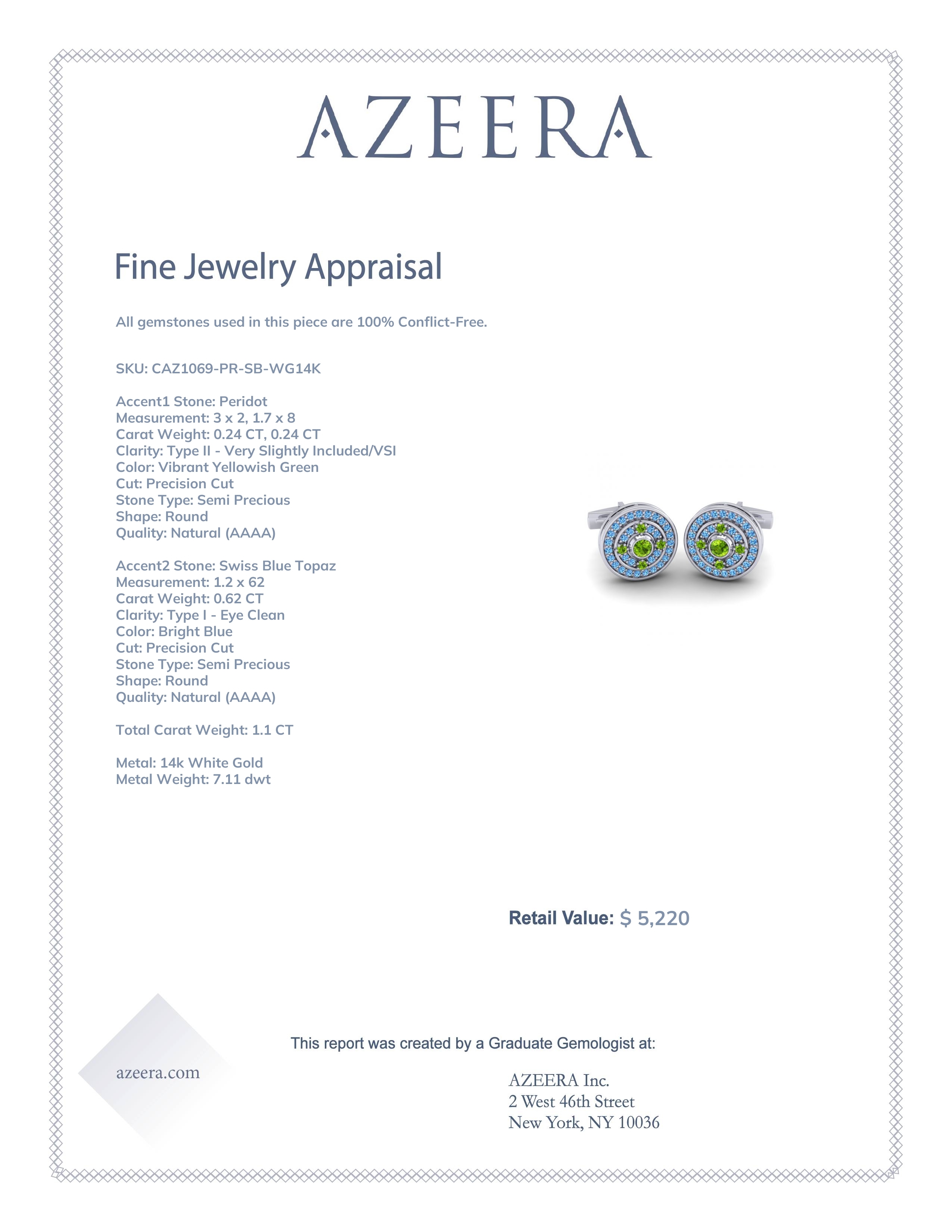 These personalized cufflinks feature Peridot and Swiss Blue Topaz. We only use the top 10% of gemstones available, every facet meticulously placed, they create a masterpiece of radiance that captivates the senses. This Pair Of Cufflinks Features A Gemstone And Metal Design That Luxurious And Bold. Each Cufflink Hosts 35 Brilliant Round Gems in A Pave Setting And One Large Brilliant Round Gem in A Bezel Setting Of Your Choice Over The Face Of The Piece. For the one who appreciates the finer things, these mens cufflinks are an unspoken badge of distinction. Choose from a variety of gems to make a truly unique pair of custom cufflinks. Enjoy free shipping, free returns and a lifetime warranty.