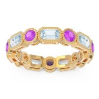 This Aquamarine and Amethyst ring is the perfect addition to you wardrobe. Not only do we use the top 10% of gemstones available, we also make everything right here in New York City. Our Fashion Rings can be added to your collection of dainty rings, or even to your collection of stacking rings. This Art Deco inspired Ring Features Round Brilliant And Emerald Cut Gems Alternating in Bezel Settings with Milgrain Detail All The Way Around The Shank in An Eternity Setting. Ditch the worry, embrace the shine with free shipping, returns, resizing and a lifetime warranty.