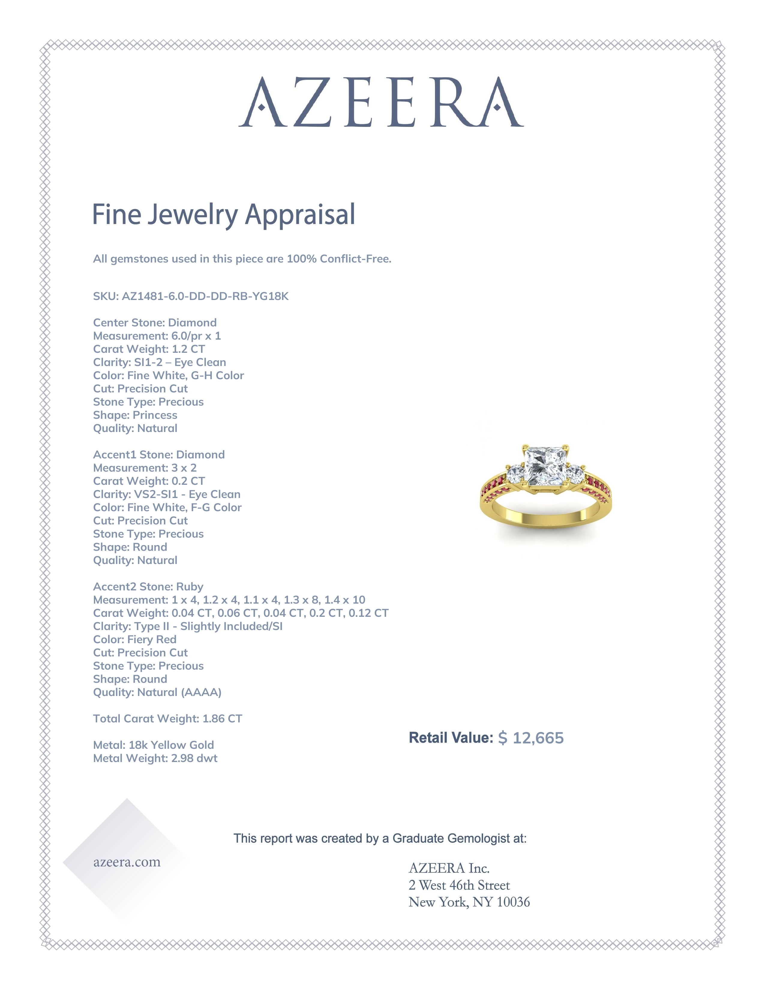 This 18k Yellow Gold Diamond ring features a AAAA Princess Diamond, along with fine quality Ruby. This Elegant Art Deco Ring Is Perfect For Any Jewelry Collection. Your Princess Cut Gem Sits in A Raised 4 Prong Setting Accented with Two Smaller Round Brilliant Gems. in Addition, A Pave Of Smaller Round Brilliant Gems Runs Along The Profile And The Upper Half Of The Band. We only use the top 10% of gems available, those found in the finest jewelry shops across the world. This Diamond engagement ring can also be worn as an Diamond and Ruby gemstone ring and added to your collection! Enjoy Free Shipping and Returns, Free Resize and a lifetime warranty.