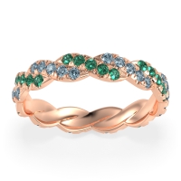 This Emerald wedding ring is casted in 18K Rose Gold and set with fine quality Emerald and Aquamarine. All of the gemstones we use are of the top 10% available, those found in fine quality boutiques across the world. This Emerald wedding band can also be added to your collection of minimalist Emerald rings. This Unique Eternity Band Showcases An intricate Braided Motif Adorned with Shimmering Pave Stones. Free shipping, returns, resizing, and a lifetime warranty ensure you love your purchase.
