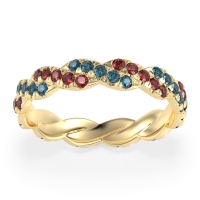 This London Blue Topaz wedding ring is casted in 18k Yellow Gold and set with fine quality London Blue Topaz and Ruby. All of the gemstones we use are of the top 10% available, those found in fine quality boutiques across the world. This London Blue Topaz wedding band can also be added to your collection of minimalist London Blue Topaz rings. This Unique Eternity Band Showcases An intricate Braided Motif Adorned with Shimmering Pave Stones. Free shipping, returns, resizing, and a lifetime warranty ensure you love your purchase.