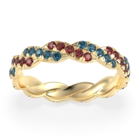 This Ruby wedding ring is casted in 18k Yellow Gold and set with fine quality Ruby and London Blue Topaz. All of the gemstones we use are of the top 10% available, those found in fine quality boutiques across the world. This Ruby wedding band can also be added to your collection of minimalist Ruby rings. This Unique Eternity Band Showcases An intricate Braided Motif Adorned with Shimmering Pave Stones. Free shipping, returns, resizing, and a lifetime warranty ensure you love your purchase.