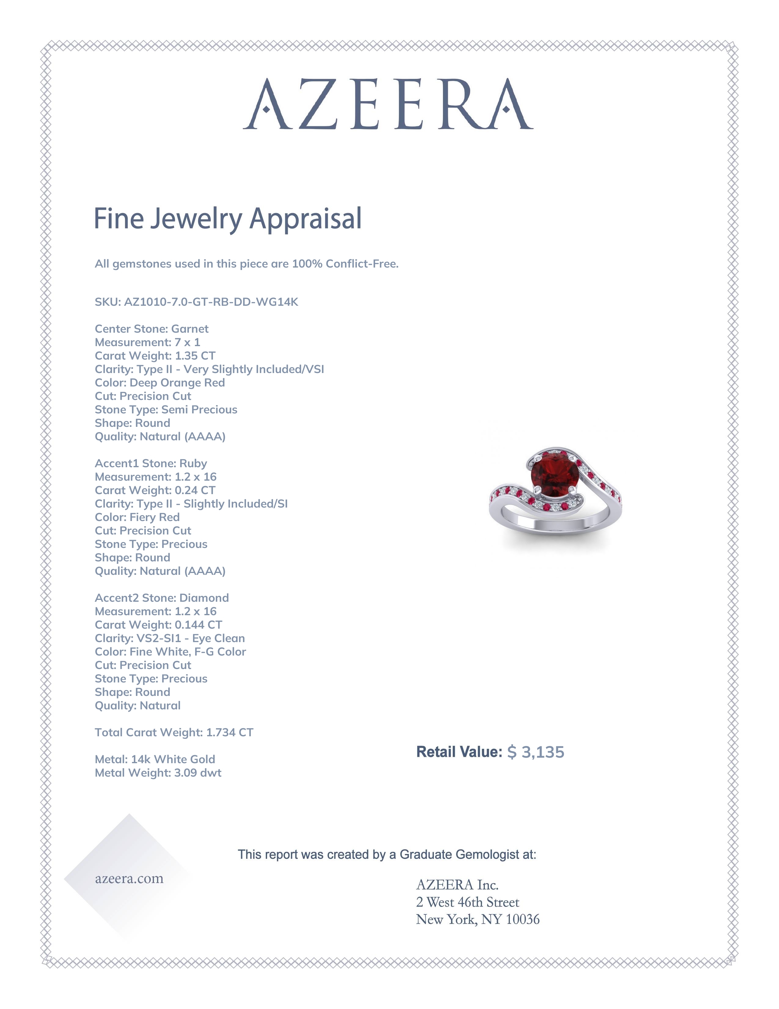 This 14k White Gold Garnet ring features a Round Garnet, along with Ruby and Diamond. This Garnet engagement ring can even be added to your collection of gemstone rings. Make this stunning Garnet engagement ring your own. This Unique Band Adds A Bit Of Sparkle To The Elegant Bypass Design. Your Round Center Stone Sits in A 4 Prong Bypass Setting with Round Brilliant Pave Along The Arms Of The Band. Slender Walls Of Precious Metal Provide Protection To Your Gems While Also Defining The Shape Of Your Ring. This product comes with Free Shipping, Free Returns, Free Resize and a lifetime warranty. Choose your favorite metal and gem combination and experience the joy of customization.