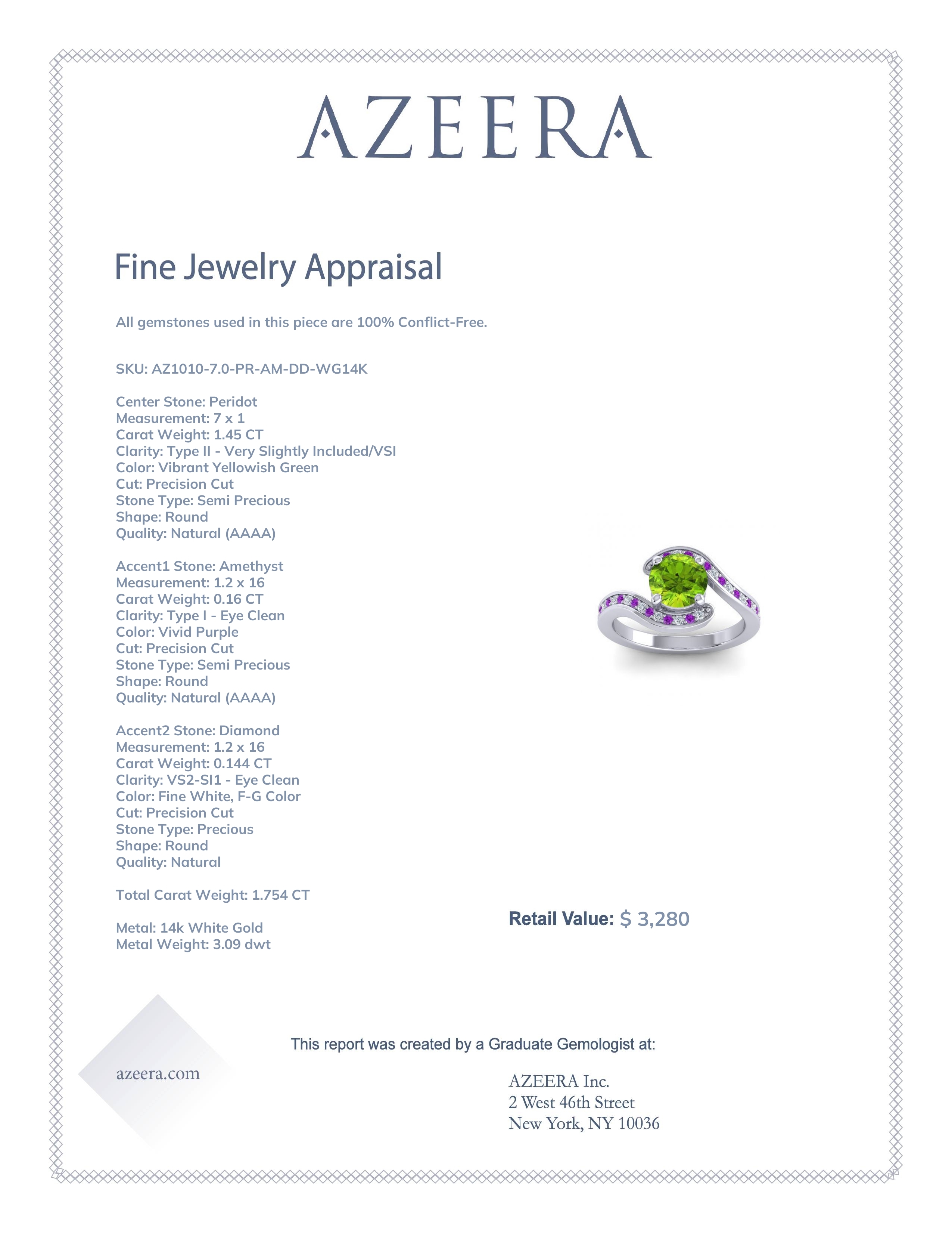 This 14k White Gold Peridot ring features a Round Peridot, along with Amethyst and Diamond. This Peridot engagement ring can even be added to your collection of gemstone rings. Make this stunning Peridot engagement ring your own. This Unique Band Adds A Bit Of Sparkle To The Elegant Bypass Design. Your Round Center Stone Sits in A 4 Prong Bypass Setting with Round Brilliant Pave Along The Arms Of The Band. Slender Walls Of Precious Metal Provide Protection To Your Gems While Also Defining The Shape Of Your Ring. This product comes with Free Shipping, Free Returns, Free Resize and a lifetime warranty. Choose your favorite metal and gem combination and experience the joy of customization.