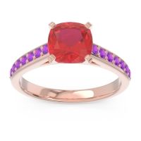 This 14K Rose Gold Lab Ruby ring features a AAAA Cushion Lab Ruby, along with fine quality Amethyst. This Ring Features A Large Cushion Cut in A Raised Cathedral Setting with Smaller Rounds Cascading Half Way Down Shank. Customize And Build Your Own Engagement Ring By Selecting The Gems And Metals Of Your Choice. We only use the top 10% of gems available, those found in the finest jewelry shops across the world. This Lab Ruby engagement ring can also be worn as an Lab Ruby and Amethyst gemstone ring and added to your collection! Enjoy Free Shipping and Returns, Free Resize and a lifetime warranty.