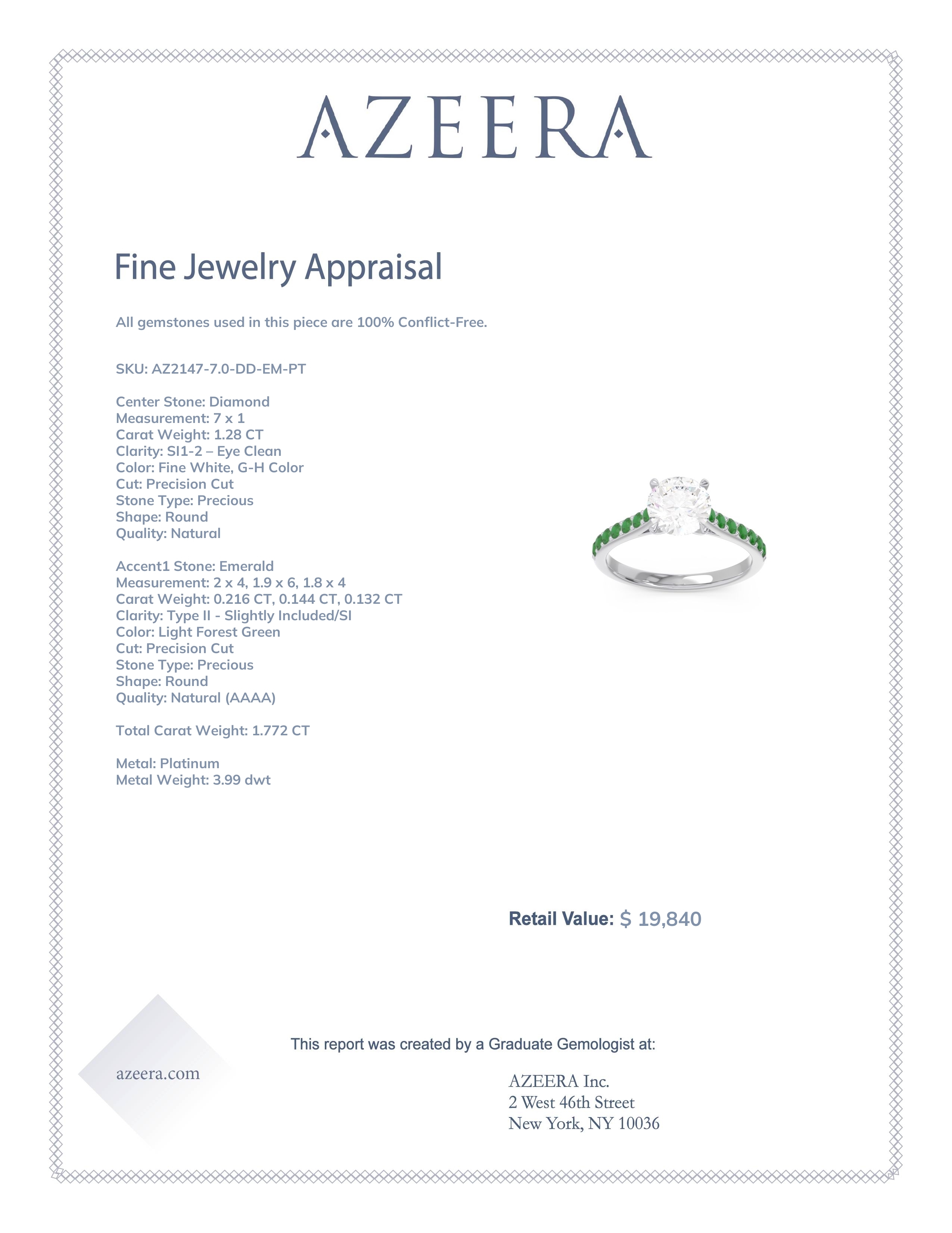 This Platinum Diamond ring features a AAAA Round Diamond, along with fine quality Emerald. This Ring Features A Large Round Brilliant Gem in A Raised 4-claw Prong Setting with Smaller Rounds Cascading Half Way Down Shank. Customize And Build Your Own Engagement Ring By Selecting The Gems And Metals Of Your Choice. We only use the top 10% of gems available, those found in the finest jewelry shops across the world. This Diamond engagement ring can also be worn as an Diamond and Emerald gemstone ring and added to your collection! Enjoy Free Shipping and Returns, Free Resize and a lifetime warranty.