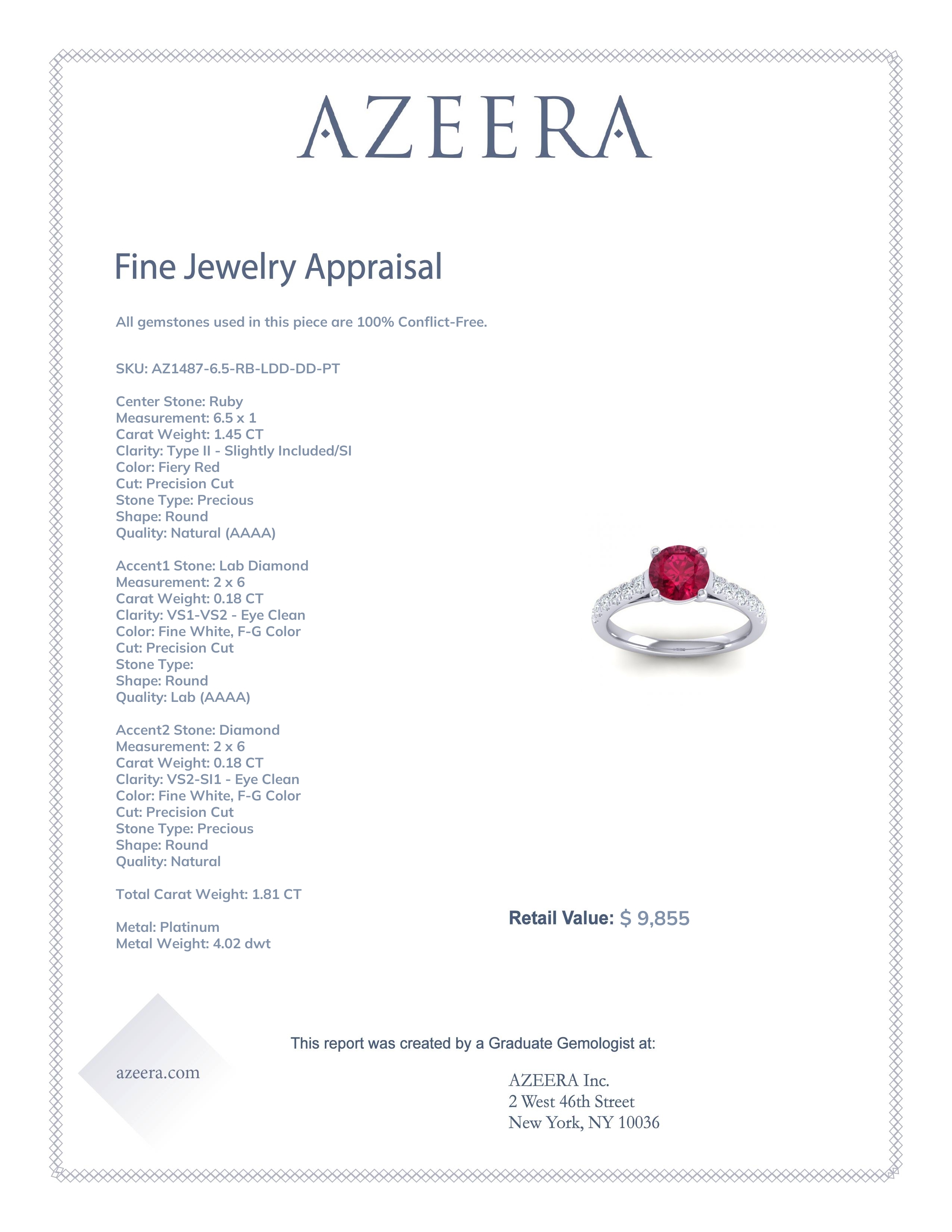 This Platinum Ruby ring features a Round Ruby, along with Lab Diamond and Diamond. This Ruby engagement ring can even be added to your collection of gemstone rings. Make this stunning Ruby engagement ring your own. This Stunning Design Has Everything You Would Want in A Fine Jewelry Piece. Your Round Center Stone Sits in A Classical 4 Prong Cathedral Setting Accented with An Elegant Scalloped Pave Of Smaller Round Brilliants. Each Design Element Is Thoughtfully Placed And Boldly Executed. This product comes with Free Shipping, Free Returns, Free Resize and a lifetime warranty. Choose your favorite metal and gem combination and experience the joy of customization.