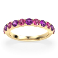 This Pink Tourmaline wedding ring is casted in 14k Yellow Gold and set with fine quality Pink Tourmaline and Amethyst. All of the gemstones we use are of the top 10% available, those found in fine quality boutiques across the world. This Pink Tourmaline wedding band can also be added to your collection of minimalist Pink Tourmaline rings. This Classic Women's Band Has 11 Prong Set Gemstones Going Halfway Down The Shank. Free shipping, returns, resizing, and a lifetime warranty ensure you love your purchase.