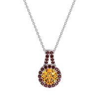 This Citrine and Ruby Necklace is casted in 14k White Gold. This Women’s Halo necklace features exceptionally fine gemstones, on par with those found in the world's most exclusive boutiques and among the top 10% available globally. Timeless Pendant Featuring A Central, Round Stone Encircled By A Halo Of Smaller Gems. The Design Is Finished with A Split Bail, Also Adorned with Sparkling Gems. This necklace comes with a complimentary 18-inch chain. Enjoy the confidence of our 30-day, stress-free return policy—with return shipping fully covered. Each piece is also accompanied by a Lifetime Warranty, ensuring lasting beauty and peace of mind.