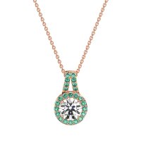 This Diamond and Emerald Necklace is casted in 18K Rose Gold. This Women’s Halo necklace features exceptionally fine gemstones, on par with those found in the world's most exclusive boutiques and among the top 10% available globally. Timeless Pendant Featuring A Central, Round Stone Encircled By A Halo Of Smaller Gems. The Design Is Finished with A Split Bail, Also Adorned with Sparkling Gems. This necklace comes with a complimentary 18-inch chain. Enjoy the confidence of our 30-day, stress-free return policy—with return shipping fully covered. Each piece is also accompanied by a Lifetime Warranty, ensuring lasting beauty and peace of mind.