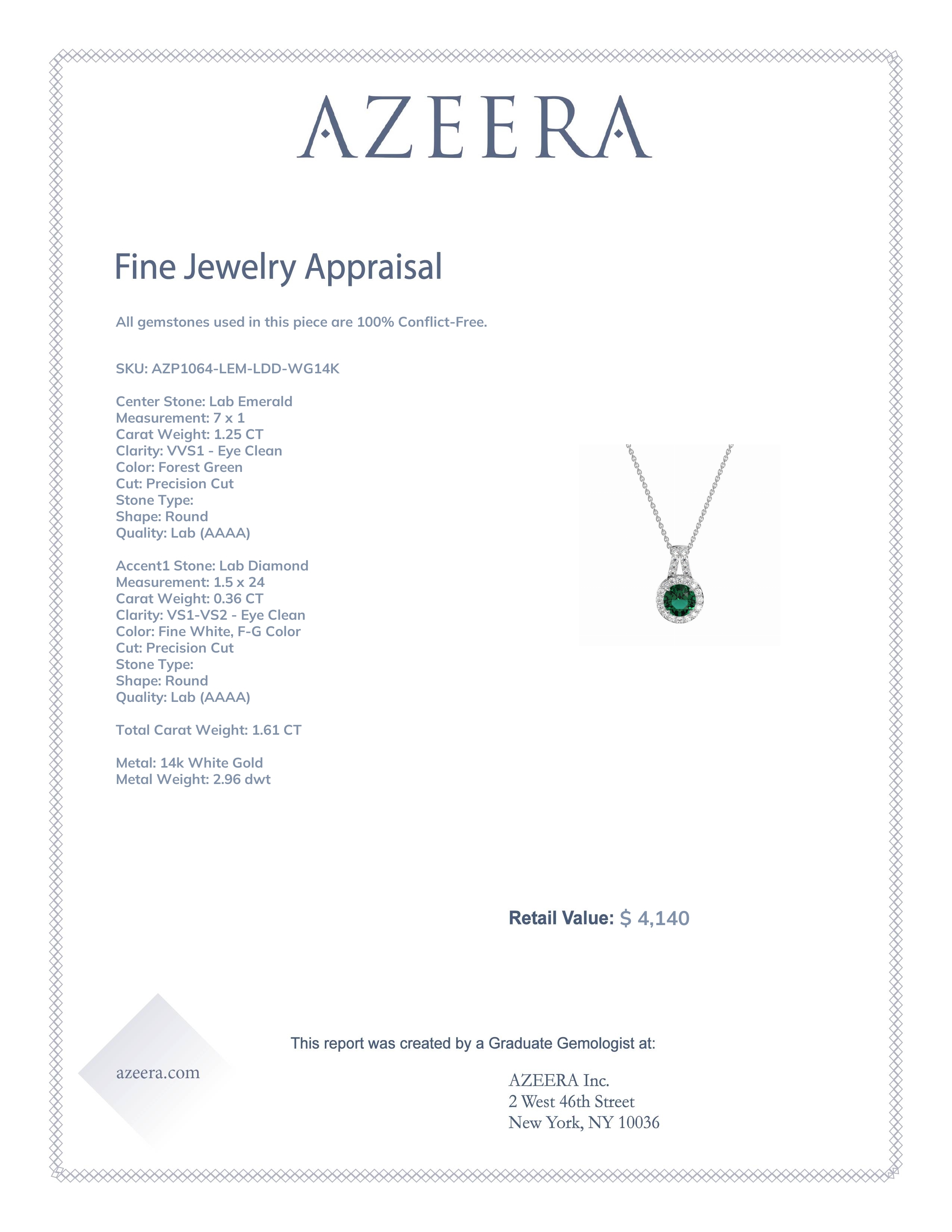 This Lab Emerald and Lab Diamond Necklace is casted in 14k White Gold. This Women’s Halo necklace features exceptionally fine gemstones, on par with those found in the world's most exclusive boutiques and among the top 10% available globally. Timeless Pendant Featuring A Central, Round Stone Encircled By A Halo Of Smaller Gems. The Design Is Finished with A Split Bail, Also Adorned with Sparkling Gems. This necklace comes with a complimentary 18-inch chain. Enjoy the confidence of our 30-day, stress-free return policy—with return shipping fully covered. Each piece is also accompanied by a Lifetime Warranty, ensuring lasting beauty and peace of mind.