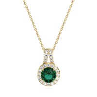 This Lab Emerald and Lab Diamond Necklace is casted in 18k Yellow Gold. This Women’s Halo necklace features exceptionally fine gemstones, on par with those found in the world's most exclusive boutiques and among the top 10% available globally. Timeless Pendant Featuring A Central, Round Stone Encircled By A Halo Of Smaller Gems. The Design Is Finished with A Split Bail, Also Adorned with Sparkling Gems. This necklace comes with a complimentary 18-inch chain. Enjoy the confidence of our 30-day, stress-free return policy—with return shipping fully covered. Each piece is also accompanied by a Lifetime Warranty, ensuring lasting beauty and peace of mind.