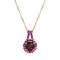This Lab Ruby and Amethyst Necklace is casted in 14k Yellow Gold. This Women’s Halo necklace features exceptionally fine gemstones, on par with those found in the world's most exclusive boutiques and among the top 10% available globally. Timeless Pendant Featuring A Central, Round Stone Encircled By A Halo Of Smaller Gems. The Design Is Finished with A Split Bail, Also Adorned with Sparkling Gems. This necklace comes with a complimentary 18-inch chain. Enjoy the confidence of our 30-day, stress-free return policy—with return shipping fully covered. Each piece is also accompanied by a Lifetime Warranty, ensuring lasting beauty and peace of mind.