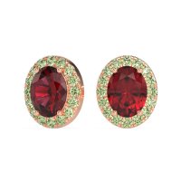 These Lab Ruby earrings and made in 14K Rose Gold with top quality Lab Ruby and Peridot gemstones. These Classic Oval Halo Stud Earrings Feature A Brilliant Oval-cut Center Stone Elegantly Encircled By A Sparkling Halo Of Smaller Gems. This Enduring Design Maximizes Light And Creates A Captivating Presence, Perfect For Adding Sophisticated Sparkle To Any Occasion. Free shipping, returns, and a lifetime warranty make luxury worry-free
