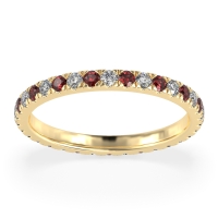 This Diamond wedding ring is casted in 14k Yellow Gold and set with fine quality Diamond and Ruby. All of the gemstones we use are of the top 10% available, those found in fine quality boutiques across the world. This Diamond wedding band can also be added to your collection of minimalist Diamond rings. This Classic Eternity Band Features 1.7mm Stones Going All The Way Around, in A Pave Setting. Free shipping, returns, resizing, and a lifetime warranty ensure you love your purchase.
