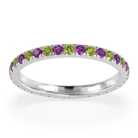 This Peridot wedding ring is casted in Platinum and set with fine quality Peridot and Amethyst. All of the gemstones we use are of the top 10% available, those found in fine quality boutiques across the world. This Peridot wedding band can also be added to your collection of minimalist Peridot rings. This Classic Eternity Band Features 1.7mm Stones Going All The Way Around, in A Pave Setting. Free shipping, returns, resizing, and a lifetime warranty ensure you love your purchase.