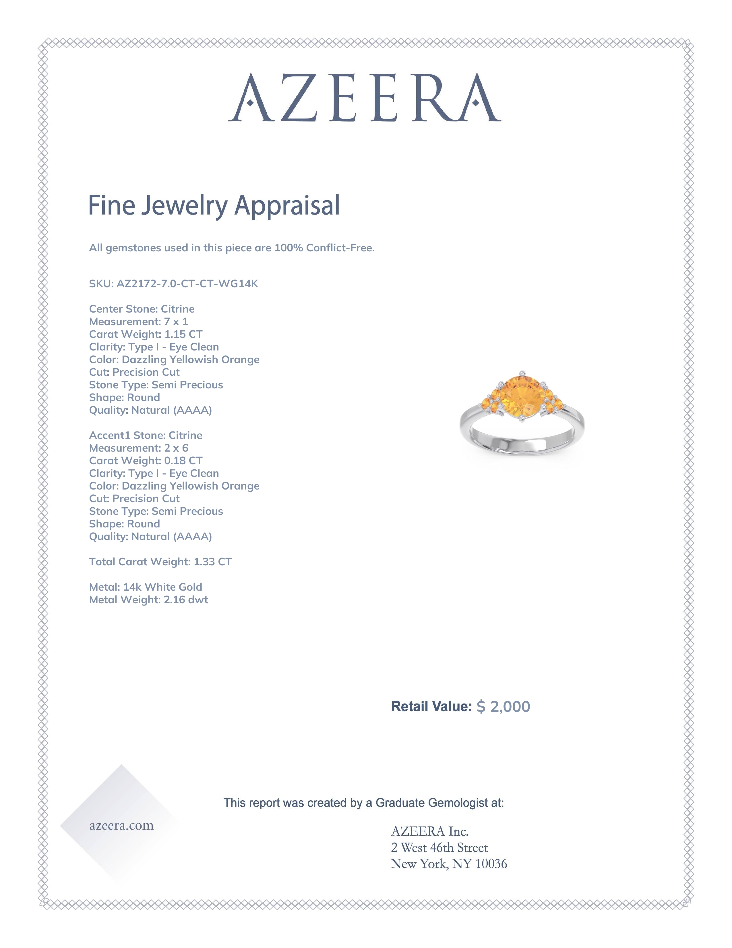 This 14k White Gold Citrine ring features a AAAA Round Citrine stone, found across the finest boutiques in the world. We only use gems that are within the top 10% of material available. This ring can be worn as an Citrine engagement ring, or can also be added to your collection of gemstone rings. This Ring Features A Large Round Brilliant Gem Flanked By Clusters Of Smaller Rounds in A Three Stone Style Setting with A Tapered Shank. We offer Free Shipping and Free Returns, along with a Free Resize. This ring also comes with a lifetime warranty which covers the integrity of our workmanship forever.