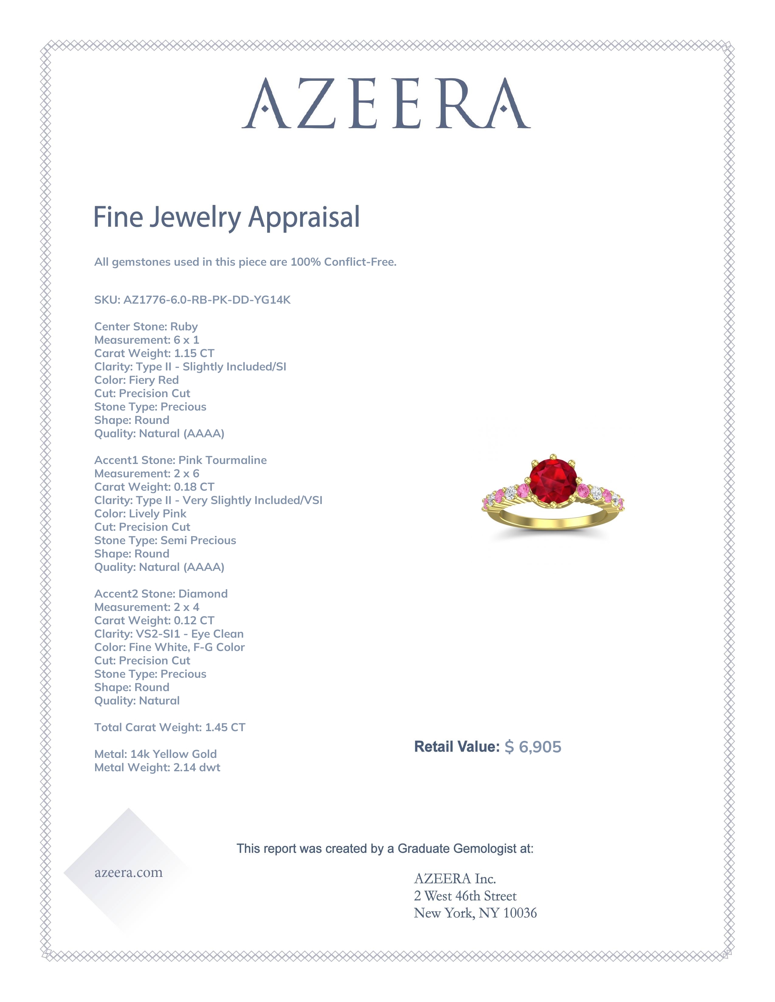 This 14k Yellow Gold Ruby ring features a Round Ruby, along with Pink Tourmaline and Diamond. This Ruby engagement ring can even be added to your collection of gemstone rings. Make this stunning Ruby engagement ring your own. This Regal Design Holds An Elegant Round Center Stone Above A Crown-like Basket Between 8 Luxurious Prongs. Your Gem Is Also Accompanied By 10 Accent Round Brilliants Acting As Royal Consorts. This product comes with Free Shipping, Free Returns, Free Resize and a lifetime warranty. Choose your favorite metal and gem combination and experience the joy of customization.