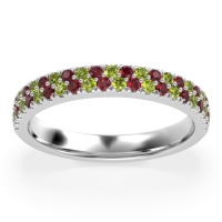 This Peridot wedding ring is casted in 18k White Gold and set with fine quality Peridot and Ruby. All of the gemstones we use are of the top 10% available, those found in fine quality boutiques across the world. This Peridot wedding band can also be added to your collection of minimalist Peridot rings. This Classic Wedding Band, Consists Of Two Rows Of Round Gemstones Going Half Way Down The Shank. Free shipping, returns, resizing, and a lifetime warranty ensure you love your purchase.