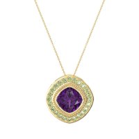 This Amethyst and Peridot Necklace is casted in 14k Yellow Gold. This Women’s Fashion necklace features exceptionally fine gemstones, on par with those found in the world's most exclusive boutiques and among the top 10% available globally. This Art Deco-inspired Pendant Showcases A Cushion-cut Stone Set At A Striking Diagonal Angle. The Halo Surrounding It Features A Delicate Milgrain Finish Along The Border, Adding A Touch Of Vintage Elegance And intricate Detail. This necklace comes with a complimentary 18-inch chain. Enjoy the confidence of our 30-day, stress-free return policy—with return shipping fully covered. Each piece is also accompanied by a Lifetime Warranty, ensuring lasting beauty and peace of mind.