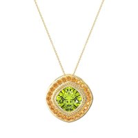 This Peridot and Citrine Necklace is casted in 14k Yellow Gold. This Women’s Fashion necklace features exceptionally fine gemstones, on par with those found in the world's most exclusive boutiques and among the top 10% available globally. This Art Deco-inspired Pendant Showcases A Cushion-cut Stone Set At A Striking Diagonal Angle. The Halo Surrounding It Features A Delicate Milgrain Finish Along The Border, Adding A Touch Of Vintage Elegance And intricate Detail. This necklace comes with a complimentary 18-inch chain. Enjoy the confidence of our 30-day, stress-free return policy—with return shipping fully covered. Each piece is also accompanied by a Lifetime Warranty, ensuring lasting beauty and peace of mind.