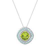 This Peridot and Swiss Blue Topaz Necklace is casted in Palladium. This Women’s Fashion necklace features exceptionally fine gemstones, on par with those found in the world's most exclusive boutiques and among the top 10% available globally. This Art Deco-inspired Pendant Showcases A Cushion-cut Stone Set At A Striking Diagonal Angle. The Halo Surrounding It Features A Delicate Milgrain Finish Along The Border, Adding A Touch Of Vintage Elegance And intricate Detail. This necklace comes with a complimentary 18-inch chain. Enjoy the confidence of our 30-day, stress-free return policy—with return shipping fully covered. Each piece is also accompanied by a Lifetime Warranty, ensuring lasting beauty and peace of mind.