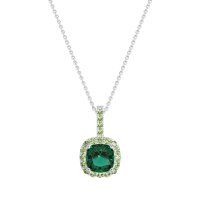 This Lab Emerald and Peridot Necklace is casted in 14k White Gold. This Women’s Halo necklace features exceptionally fine gemstones, on par with those found in the world's most exclusive boutiques and among the top 10% available globally. Elegant Pendant Featuring A Central Cushion-cut Stone Embraced By A Halo Of Smaller Stones. The Bail Is Also Adorned with Delicate Stone Accents. This necklace comes with a complimentary 18-inch chain. Enjoy the confidence of our 30-day, stress-free return policy—with return shipping fully covered. Each piece is also accompanied by a Lifetime Warranty, ensuring lasting beauty and peace of mind.