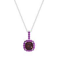 This Lab Ruby and Amethyst Necklace is casted in 14k White Gold. This Women’s Halo necklace features exceptionally fine gemstones, on par with those found in the world's most exclusive boutiques and among the top 10% available globally. Elegant Pendant Featuring A Central Cushion-cut Stone Embraced By A Halo Of Smaller Stones. The Bail Is Also Adorned with Delicate Stone Accents. This necklace comes with a complimentary 18-inch chain. Enjoy the confidence of our 30-day, stress-free return policy—with return shipping fully covered. Each piece is also accompanied by a Lifetime Warranty, ensuring lasting beauty and peace of mind.