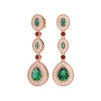 These 14K Rose Gold Emerald earrings feature fine quality with Emerald, Ruby and Lab Diamond gemstones. These Classic Dangling Earrings Showcase A Captivating Combination Of Halo-set Pear And Marquise Gemstones, Secured With A Comfortable Pushback Closure. Free shipping, returns, and a lifetime warranty make luxury worry-free.