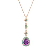 This Amethyst and Emerald Necklace is casted in 14K Rose Gold. This Women’s Halo necklace features exceptionally fine gemstones, on par with those found in the world's most exclusive boutiques and among the top 10% available globally. Elegant, Elongated Pendant Featuring A Pear-shaped Stone At The Base, Followed By Two Square And One Marquise-shaped Designs, Set with Round Gems. This necklace comes with a complimentary 18-inch chain. Enjoy the confidence of our 30-day, stress-free return policy—with return shipping fully covered. Each piece is also accompanied by a Lifetime Warranty, ensuring lasting beauty and peace of mind.