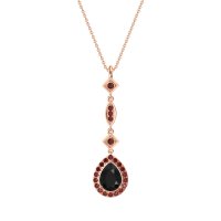 This Black Onyx and Ruby Necklace is casted in 14K Rose Gold. This Women’s Halo necklace features exceptionally fine gemstones, on par with those found in the world's most exclusive boutiques and among the top 10% available globally. Elegant, Elongated Pendant Featuring A Pear-shaped Stone At The Base, Followed By Two Square And One Marquise-shaped Designs, Set with Round Gems. This necklace comes with a complimentary 18-inch chain. Enjoy the confidence of our 30-day, stress-free return policy—with return shipping fully covered. Each piece is also accompanied by a Lifetime Warranty, ensuring lasting beauty and peace of mind.