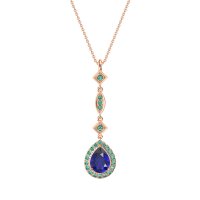 This Blue Sapphire and Emerald Necklace is casted in 14K Rose Gold. This Women’s Halo necklace features exceptionally fine gemstones, on par with those found in the world's most exclusive boutiques and among the top 10% available globally. Elegant, Elongated Pendant Featuring A Pear-shaped Stone At The Base, Followed By Two Square And One Marquise-shaped Designs, Set with Round Gems. This necklace comes with a complimentary 18-inch chain. Enjoy the confidence of our 30-day, stress-free return policy—with return shipping fully covered. Each piece is also accompanied by a Lifetime Warranty, ensuring lasting beauty and peace of mind.
