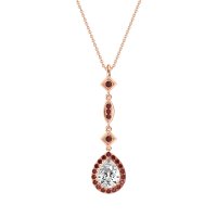 This Diamond and Ruby Necklace is casted in 14K Rose Gold. This Women’s Halo necklace features exceptionally fine gemstones, on par with those found in the world's most exclusive boutiques and among the top 10% available globally. Elegant, Elongated Pendant Featuring A Pear-shaped Stone At The Base, Followed By Two Square And One Marquise-shaped Designs, Set with Round Gems. This necklace comes with a complimentary 18-inch chain. Enjoy the confidence of our 30-day, stress-free return policy—with return shipping fully covered. Each piece is also accompanied by a Lifetime Warranty, ensuring lasting beauty and peace of mind.