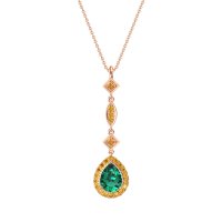 This Emerald and Citrine Necklace is casted in 14K Rose Gold. This Women’s Halo necklace features exceptionally fine gemstones, on par with those found in the world's most exclusive boutiques and among the top 10% available globally. Elegant, Elongated Pendant Featuring A Pear-shaped Stone At The Base, Followed By Two Square And One Marquise-shaped Designs, Set with Round Gems. This necklace comes with a complimentary 18-inch chain. Enjoy the confidence of our 30-day, stress-free return policy—with return shipping fully covered. Each piece is also accompanied by a Lifetime Warranty, ensuring lasting beauty and peace of mind.