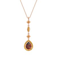 This Garnet and Citrine Necklace is casted in 14K Rose Gold. This Women’s Halo necklace features exceptionally fine gemstones, on par with those found in the world's most exclusive boutiques and among the top 10% available globally. Elegant, Elongated Pendant Featuring A Pear-shaped Stone At The Base, Followed By Two Square And One Marquise-shaped Designs, Set with Round Gems. This necklace comes with a complimentary 18-inch chain. Enjoy the confidence of our 30-day, stress-free return policy—with return shipping fully covered. Each piece is also accompanied by a Lifetime Warranty, ensuring lasting beauty and peace of mind.