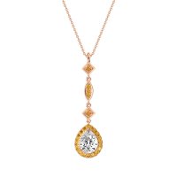 This Lab Diamond and Citrine Necklace is casted in 14K Rose Gold. This Women’s Halo necklace features exceptionally fine gemstones, on par with those found in the world's most exclusive boutiques and among the top 10% available globally. Elegant, Elongated Pendant Featuring A Pear-shaped Stone At The Base, Followed By Two Square And One Marquise-shaped Designs, Set with Round Gems. This necklace comes with a complimentary 18-inch chain. Enjoy the confidence of our 30-day, stress-free return policy—with return shipping fully covered. Each piece is also accompanied by a Lifetime Warranty, ensuring lasting beauty and peace of mind.