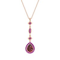 This Ruby and Amethyst Necklace is casted in 14K Rose Gold. This Women’s Halo necklace features exceptionally fine gemstones, on par with those found in the world's most exclusive boutiques and among the top 10% available globally. Elegant, Elongated Pendant Featuring A Pear-shaped Stone At The Base, Followed By Two Square And One Marquise-shaped Designs, Set with Round Gems. This necklace comes with a complimentary 18-inch chain. Enjoy the confidence of our 30-day, stress-free return policy—with return shipping fully covered. Each piece is also accompanied by a Lifetime Warranty, ensuring lasting beauty and peace of mind.