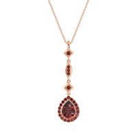 This Ruby Halo Necklace is casted in 14K Rose Gold. We use only exceptionally fine gemstones, truly on par with those found in the world's most exclusive boutiques and representing the top 10% available globally. Elegant, Elongated Pendant Featuring A Pear-shaped Stone At The Base, Followed By Two Square And One Marquise-shaped Designs, Set with Round Gems. You'll get a complimentary 18-inch chain with every necklace. Plus, enjoy a 30-day, hassle-free return policy (we even cover return shipping!) and a Lifetime Warranty for peace of mind.