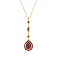 This Ruby Halo Necklace is casted in 14k Yellow Gold. We use only exceptionally fine gemstones, truly on par with those found in the world's most exclusive boutiques and representing the top 10% available globally. Elegant, Elongated Pendant Featuring A Pear-shaped Stone At The Base, Followed By Two Square And One Marquise-shaped Designs, Set with Round Gems. You'll get a complimentary 18-inch chain with every necklace. Plus, enjoy a 30-day, hassle-free return policy (we even cover return shipping!) and a Lifetime Warranty for peace of mind.