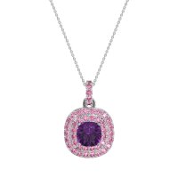 This Amethyst and Pink Tourmaline Necklace is casted in 14k White Gold. This Women’s Halo necklace features exceptionally fine gemstones, on par with those found in the world's most exclusive boutiques and among the top 10% available globally. Double Halo Pendant Showcasing A Cushion-cut Center Stone Framed By A Double Halo Of Shimmering Accents. This necklace comes with a complimentary 18-inch chain. Enjoy the confidence of our 30-day, stress-free return policy—with return shipping fully covered. Each piece is also accompanied by a Lifetime Warranty, ensuring lasting beauty and peace of mind.